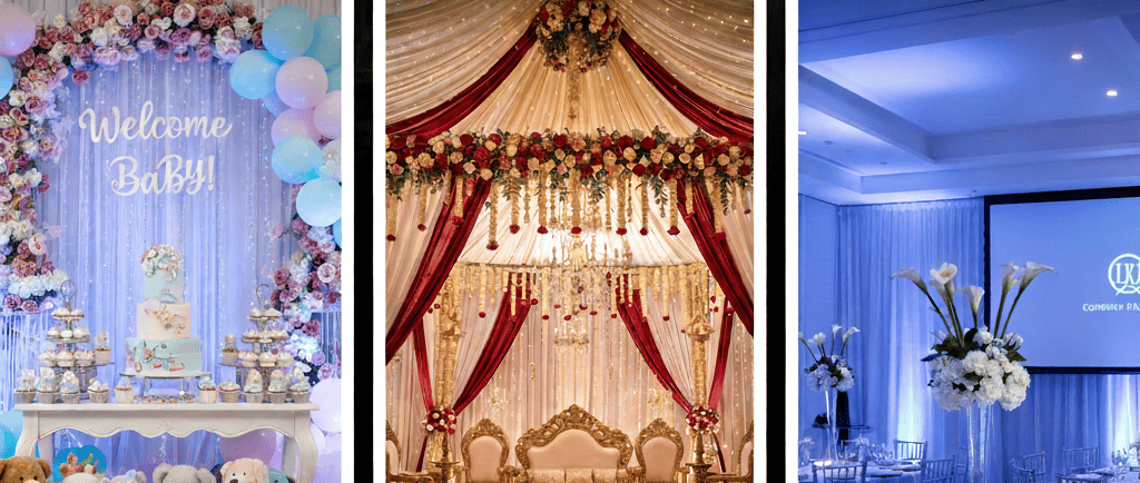 As a leading decoration company in Ilford and London, we provide customized décor solutions that match your event theme, cultural preferences, and budget. Our services cover Asian, Muslim, Hindu, Christian, Tamil, Punjabi, Sri Lankan, Bangladeshi, and Western-style events.