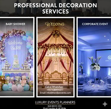 If you are searching for Decoration services in Ilford or a professional Decoration company in London, we provide complete décor solutions for weddings, birthdays, corporate functions, baby showers, and cultural events. With creative designers, affordable packages, and high-quality materials, we transform your venue into a beautiful, memorable space.
